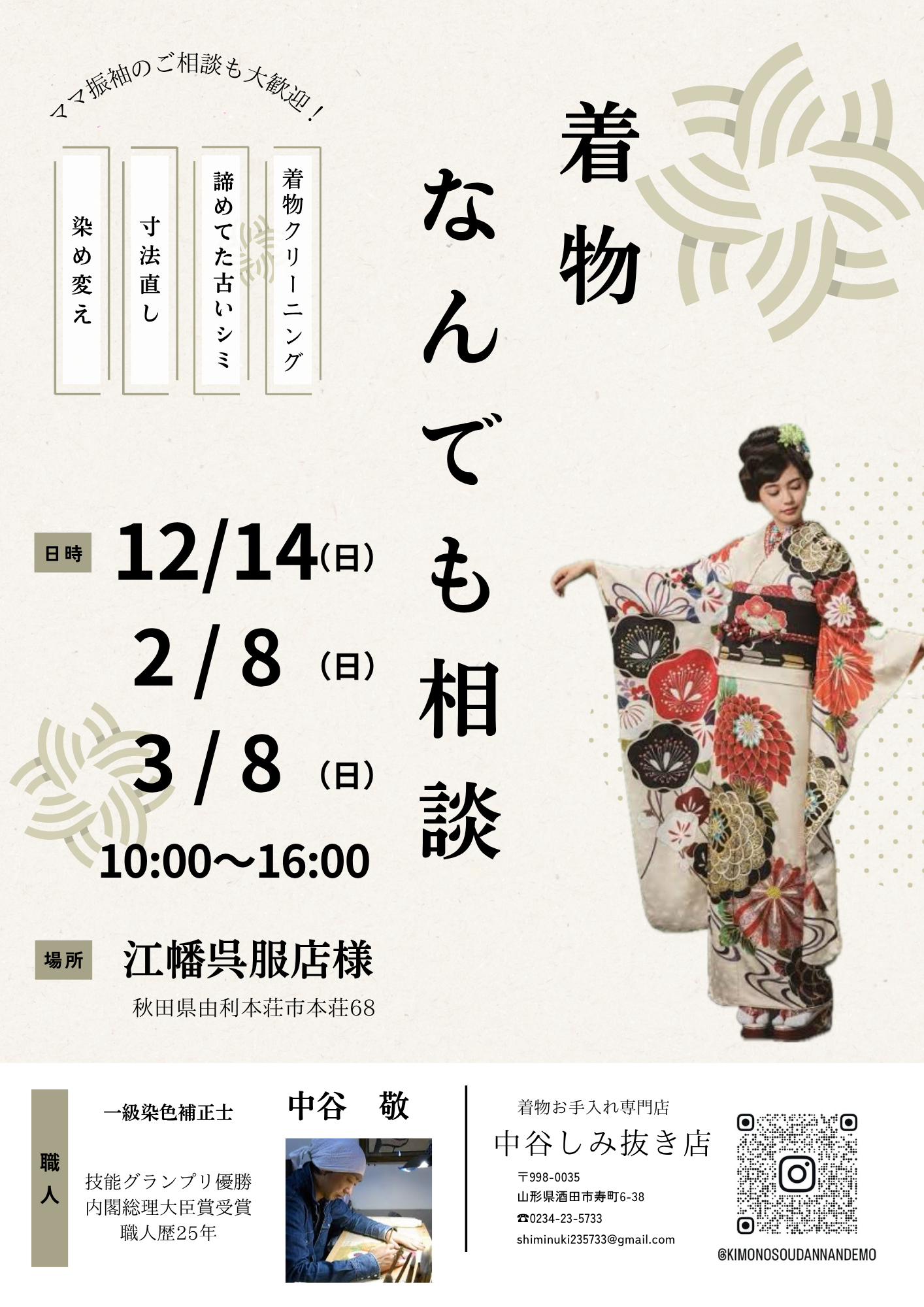 山形県酒田市にある創業80 余年の中谷しみ抜き店は、染み抜き・湯通し・紋入れ・洗張り等着物のお手入れ専門店です。